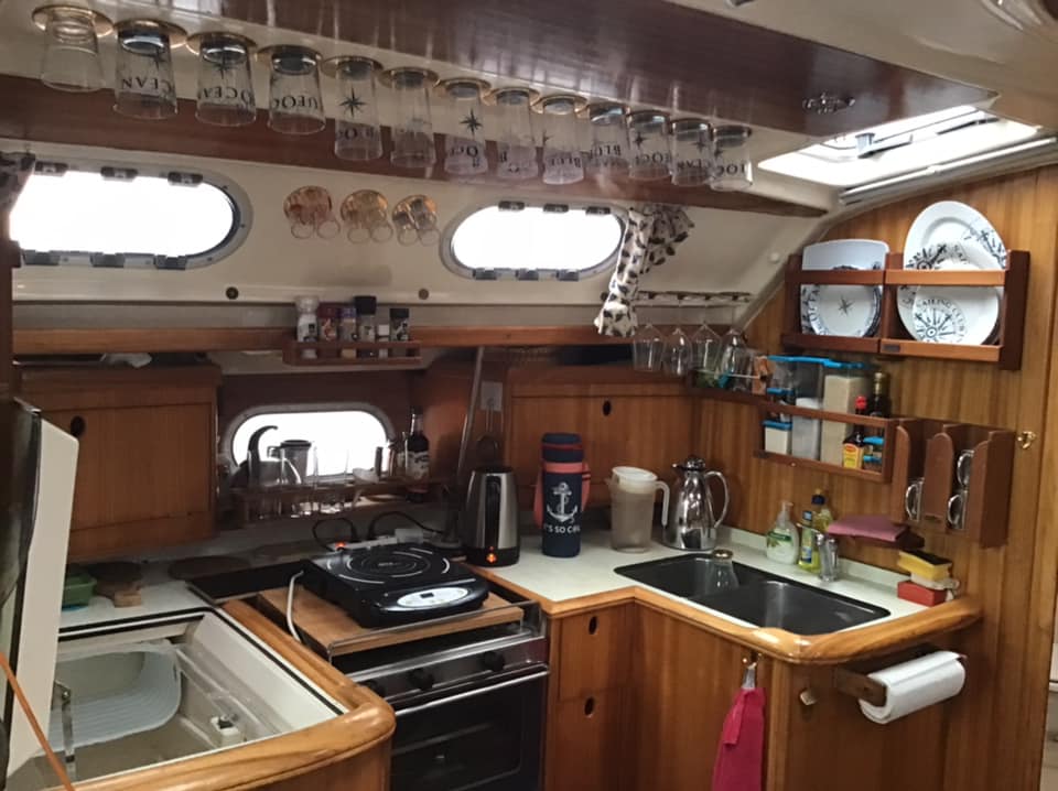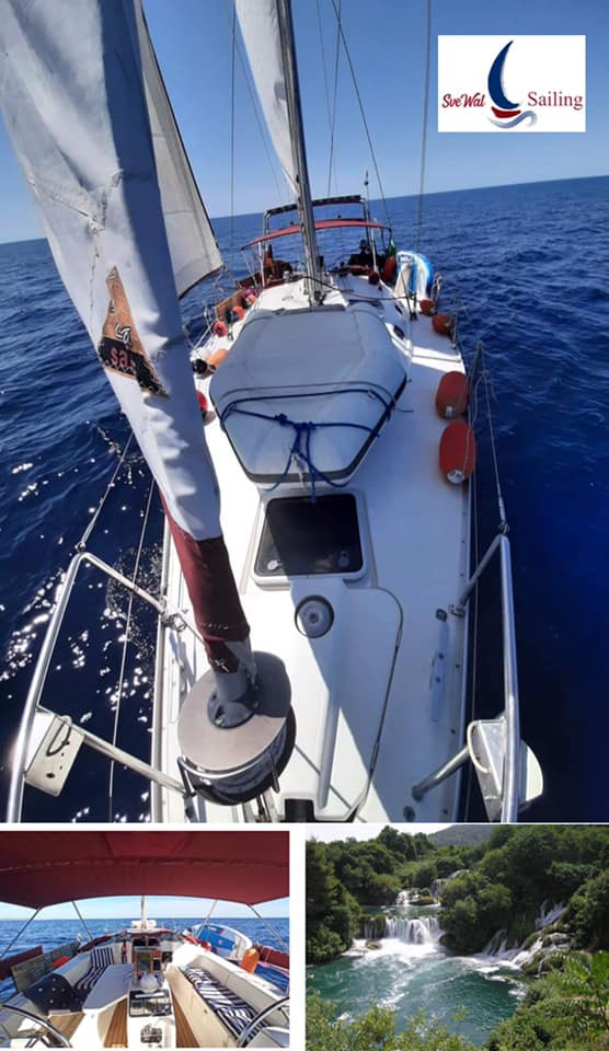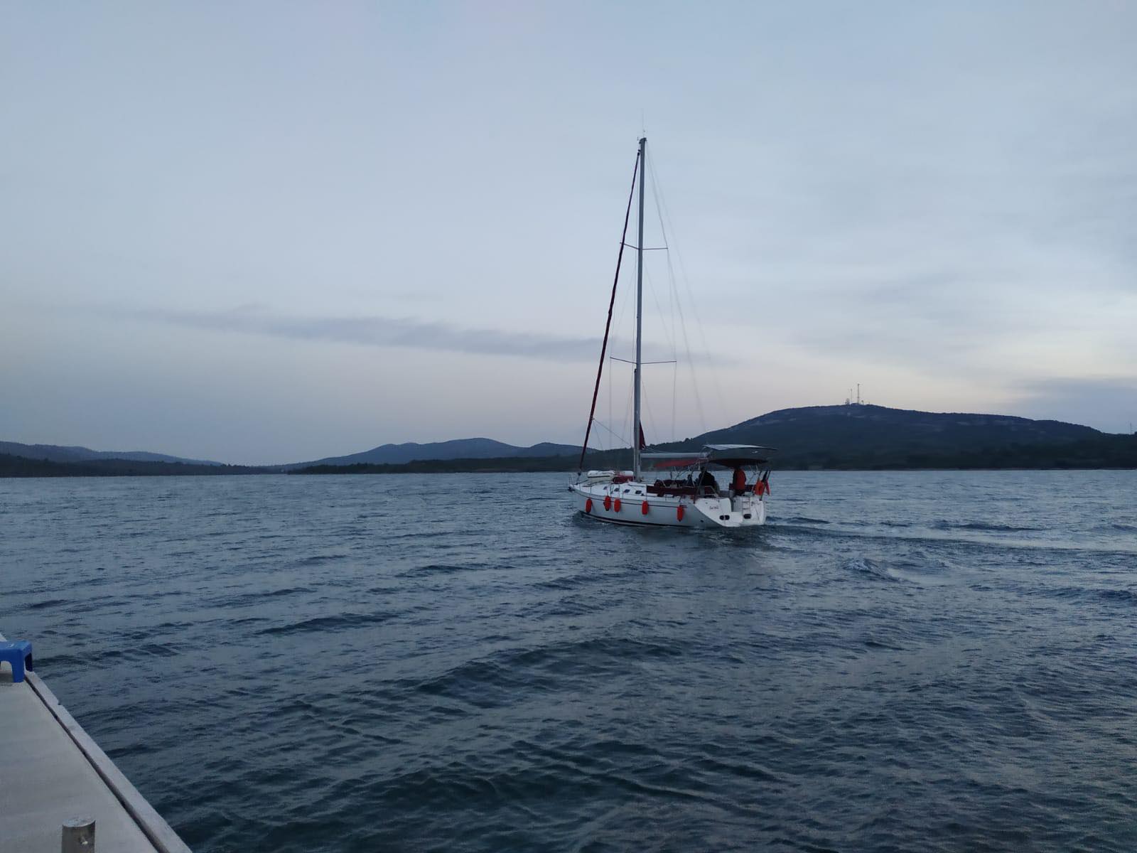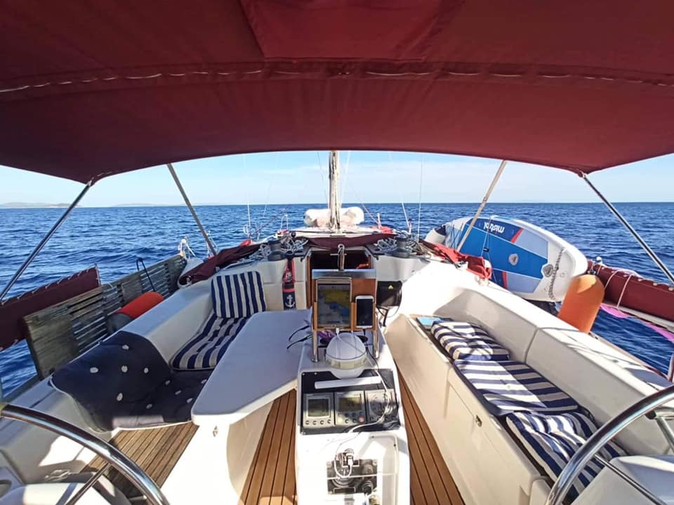 DUFOUR 43 Länge 13,05 m, Breite 4,30 m, Tiefgang 2 m, Großsegel 30 m², Genua 63 m², Es verfügt über zwei Achterkabinen mit je zwei Kojen, eine Vorschiffskabine mit zwei Kojen und eine als Etagenbett ausgeführte Koje an Steuerbord. Es gibt 8 Schlafplätze. Aufenthaltsraum vorhanden. Gegenüber der Kabine mit Etagenbett befindet sich eine Toilette mit Toilette und Dusche, und zwischen der Kabine auf dem linken Dach und dem Höschen befindet sich eine zweite Toilette mit einer neuen (2022) elektrischen Toilette. Pantry (Küche) befindet sich auf der Backbordseite. Es umfasst einen Zwei-Flammen-Herd mit Backofen, eine Spüle mit zwei Spülbecken und einen großen Kühlschrank. Der Loungetisch befindet sich auf der Steuerbordseite. Vorhanden: Radio, TV mit USB, SRC UKW-Funk, Navigation und Elektronik, Wasserkocher, 600 W Sonnenkollektoren, 2 Frischwassertanks 240l und 280l Es gibt ein Schlauchboot für 4 Personen + Motor 2.3 - 2021 Honda. MISTral-Board
